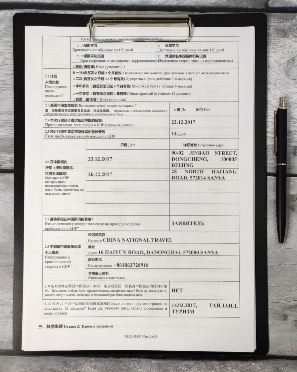 Заполненная анкета на визу в Китай с разделом маршрута поездки