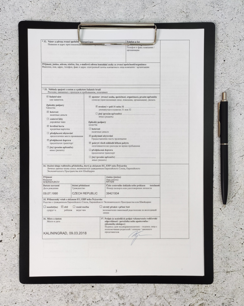 На фото показан заполненный лист анкеты для получения визы, закрепленный на планшете. В анкете указаны данные о финансировании поездки, месте проживания, а также информация о члене семьи — гражданине Чехии. Внизу проставлена дата и подпись, место заполнения — Калининград. Справа от планшета расположена ручка. Снимок можно использовать в материалах о визовых процедурах и необходимых документах для Чехии.