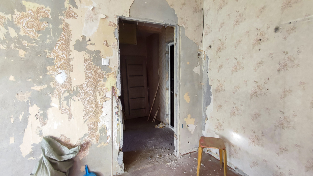 Фотография показывает процесс ремонта в жилой квартире: дверь и часть стены демонтированы, на полу строительный мусор. На стенах сохранились фрагменты старых обоев с разными узорами, частично снятыми в ходе работ. Видна старая электропроводка и остатки штукатурки. Кадр отражает реальный этап капитального ремонта, когда производится подготовка помещения к обновлению отделки. Снимок можно использовать в материалах о ремонте жилья, демонтаже и реконструкции.