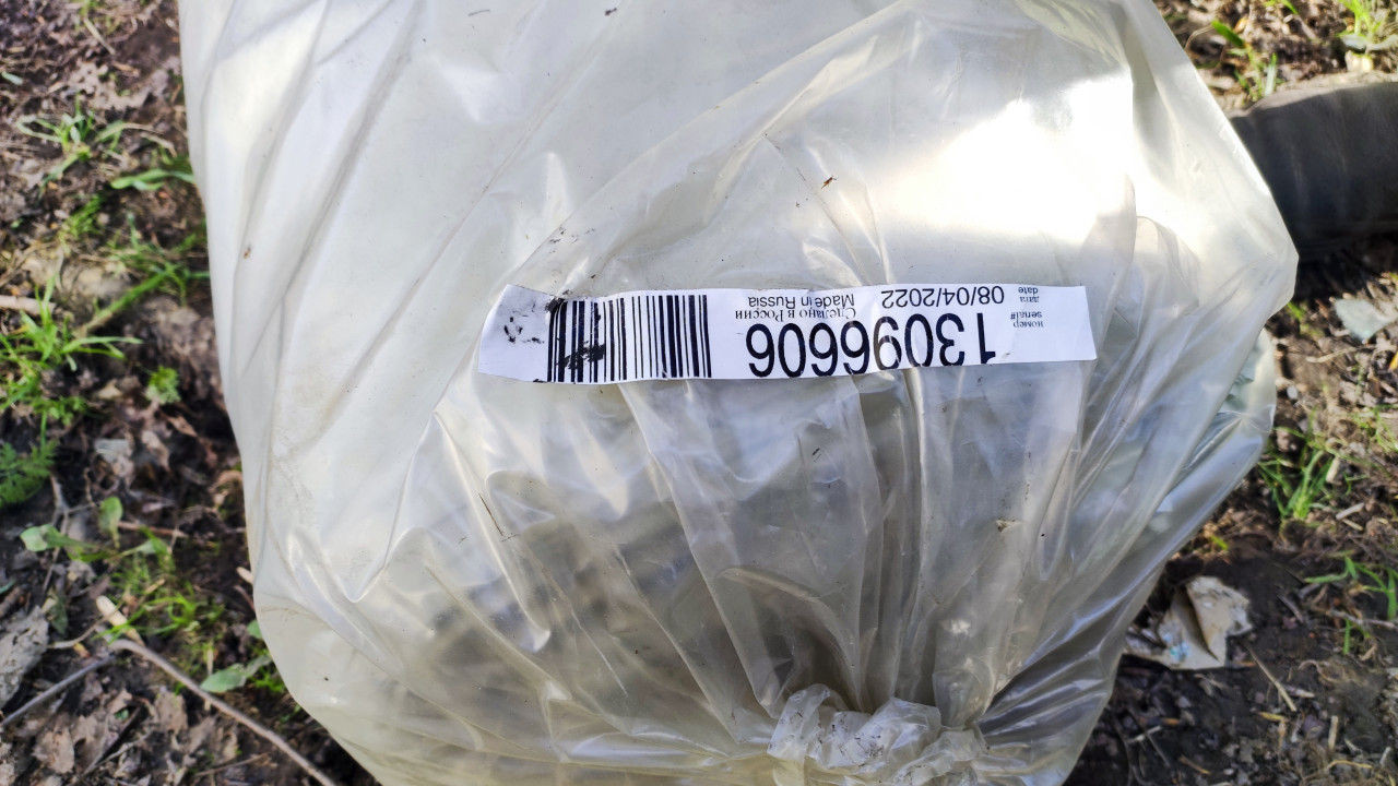 На фотографии крупным планом изображён полиэтиленовый мешок с наклеенной маркировкой и штрихкодом. Указаны дата и страна производства — Россия. Мешок лежит на земле среди листвы и травы, вероятно, в зоне строительных работ. Такой кадр может использоваться для тем, связанных с маркировкой товаров, хранением и транспортировкой строительных или хозяйственных материалов.