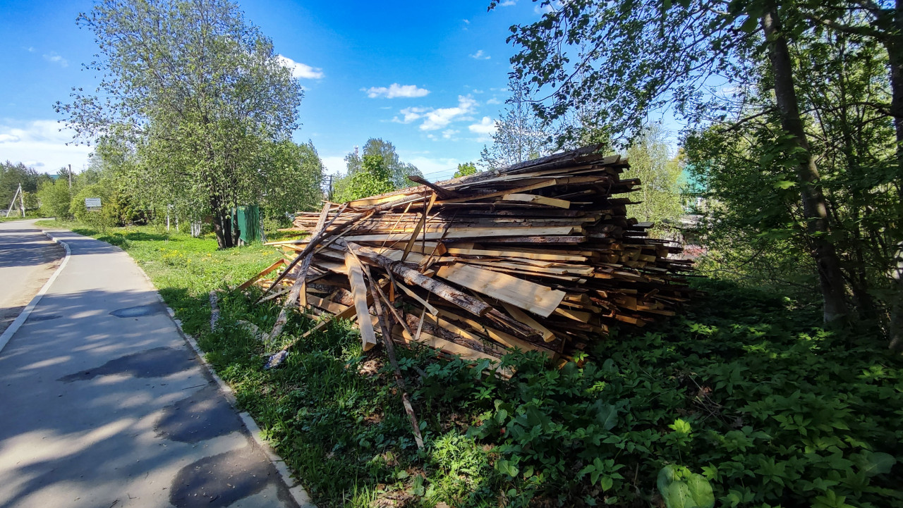 На снимке показан штабель свежераспиленных досок с остатками коры, уложенных вдоль дороги. Древесина размещена в зеленой зоне, рядом с тротуаром и проезжей частью. На заднем плане виден асфальтовый тротуар и деревья, создающие ощущение сельской или дачной улицы. Фотография подходит для использования в темах строительства, деревообработки и заготовки пиломатериалов.