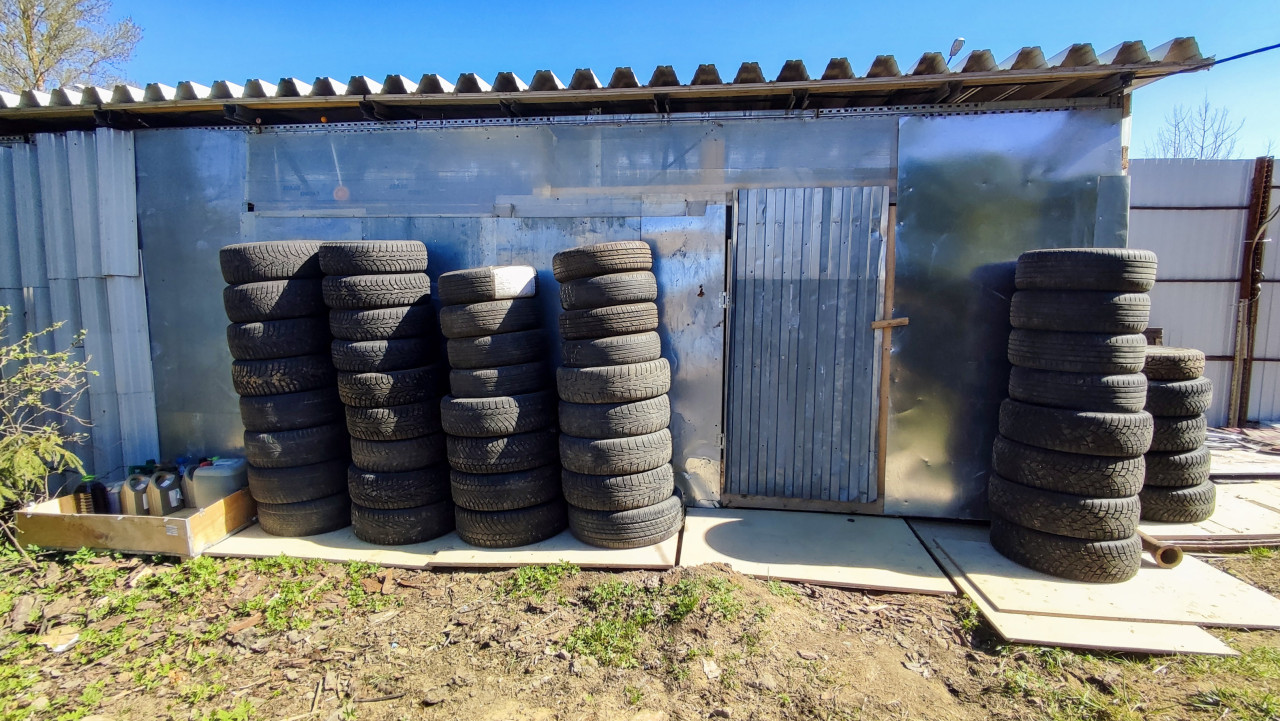 На снимке показан металлический гараж или ангар с волнистой крышей, рядом с которым выстроены в ряды подержанные автомобильные шины. Справа и слева от двери видны высокие стопки покрышек, а в деревянной коробке слева находятся пластиковые канистры и бутыли с техническими жидкостями. Снимок сделан днём на открытом воздухе, при ярком солнечном освещении. Изображение подходит для иллюстраций на темы гаражного хозяйства, хранения запчастей, автосервисов и переработки шин.
