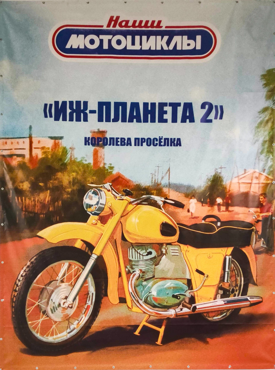 На фото изображён рекламный плакат советского мотоцикла «ИЖ-Планета 2», известного как массовая модель 1960-х годов. На плакате присутствует надпись «Королева просёлка», подчёркивающая надёжность мотоцикла для сельской местности. Постер отражает характерный стиль советской рекламы.
