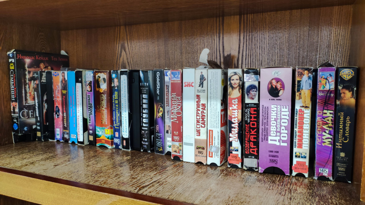 Ряд VHS-кассет с художественными фильмами и мультфильмами на полке