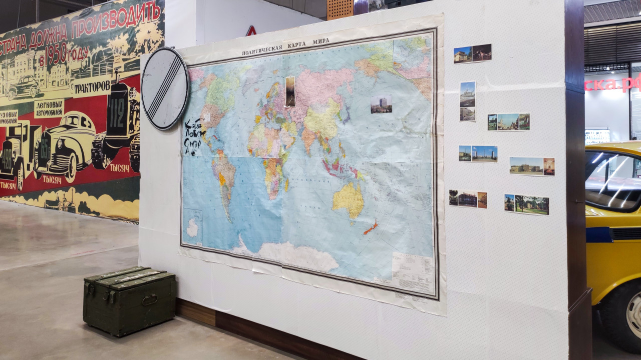 Карта мира с настенными открытками и плакатом советской эпохи