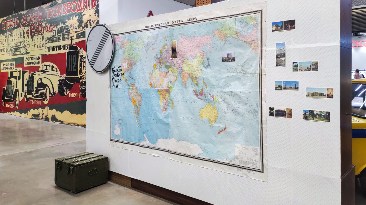 Карта мира с настенными открытками и плакатом советской эпохи