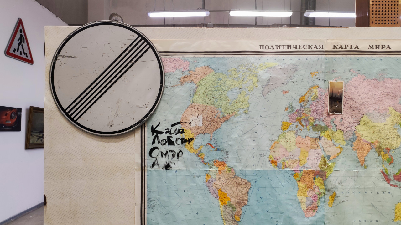 На фотографии изображён дорожный знак «Отмена всех ограничений» (Россия, ГОСТ) на стенде с развешенной политической картой мира в русском издании. Видны материки и страны, а также отдельные надписи и наклеенные фотографии. Слева заметен элемент другого дорожного знака. Сцена снята в музейном или выставочном пространстве, где сочетаются экспонаты по автотематике и географии.