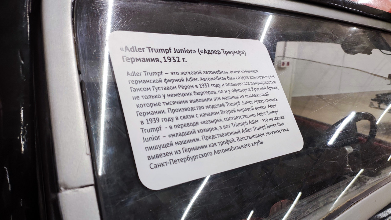 Фотография показывает музейную табличку рядом с автомобилем Adler Trumpf Junior, выпущенным в Германии в 1932 году. В тексте указано, что модель разработана конструктором Гансом Густавом Рэером и пользовалась популярностью в Европе и СССР, где такие машины попадали как трофеи. Производство прекратилось в 1939 году с началом войны. Табличка подчеркивает культурно-историческую значимость автомобиля как части довоенного немецкого автопрома.