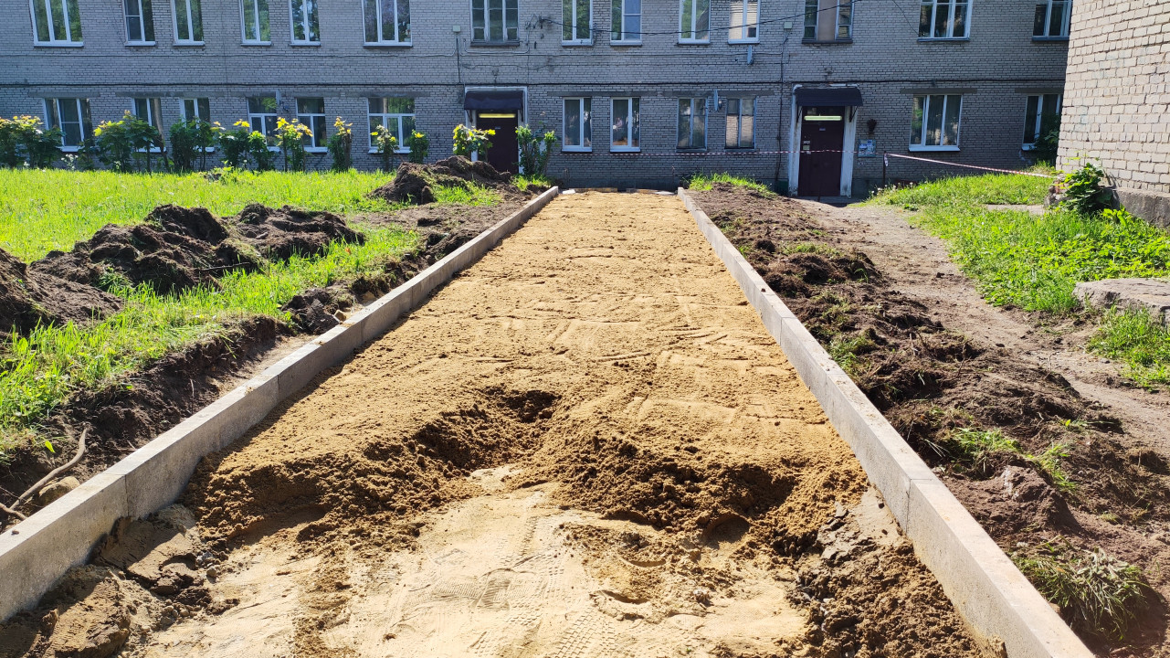 Песчаная подготовка и бордюры перед многоквартирным домом