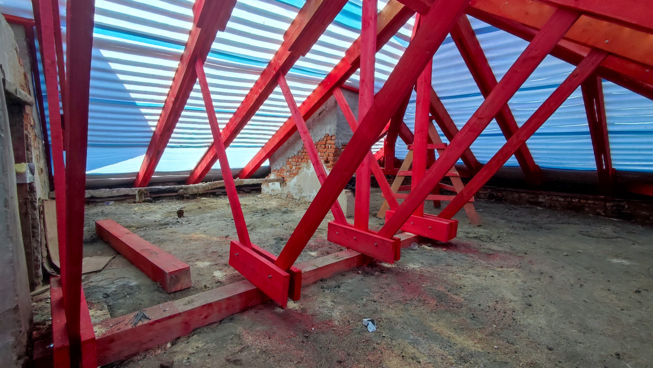 На снимке показан чердак жилого здания в стадии капитального ремонта. На переднем плане выделяются красные деревянные балки и опоры крыши, соединённые металлическими болтами. На заднем плане заметны участки старой кирпичной кладки, частично покрытой штукатуркой. Свет проникает сквозь временное плёночное покрытие, создавая равномерное освещение пространства. На полу видны строительные остатки и детали конструкции. Кадр иллюстрирует этап модернизации и укрепления кровельной системы.