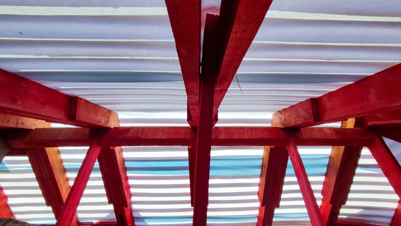 На фотографии изображена внутренняя часть чердака в процессе капитального ремонта крыши. Видны новые деревянные балки и стропила красного цвета, закреплённые металлическими соединениями. Поверх конструкции уложено временное светопрозрачное покрытие, пропускающее солнечный свет. Кадр фиксирует техническую деталь монтажа стропильной системы с нижнего ракурса. Это изображение может использоваться в материалах о строительных технологиях, кровельных работах и реконструкции зданий.