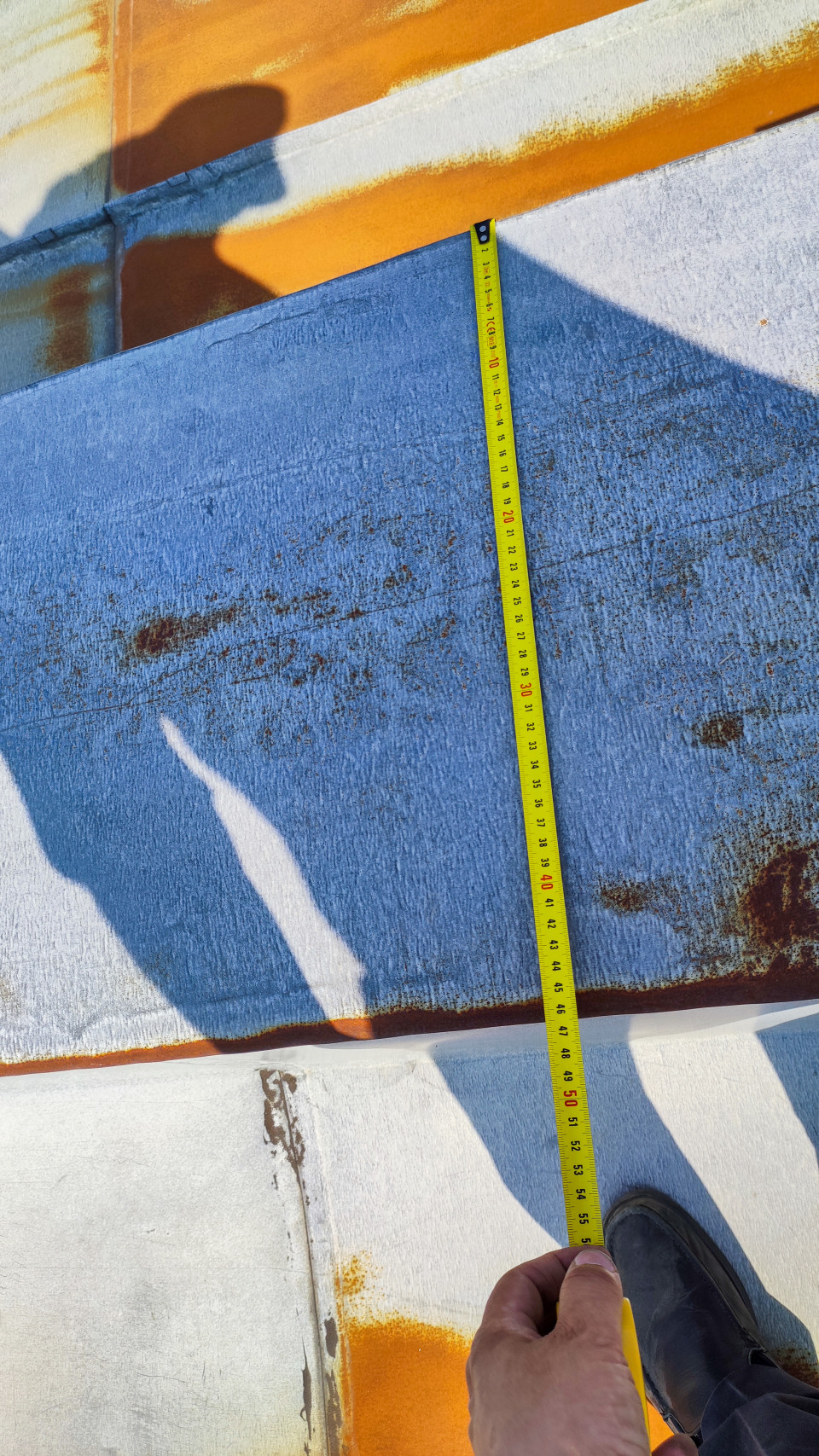 Фотография показывает процесс измерения листа металлической кровли на крыше здания в Санкт-Петербурге. На фото рука с рулеткой, зафиксированной на отметке около 50 см, тень человека и ботинок на поверхности крыши. Металлический лист покрыт ржавчиной и следами износа. Кадр выполнен днём при ясной погоде. Изображение может использоваться для иллюстраций о технических работах, замерах и ремонте кровельных конструкций.