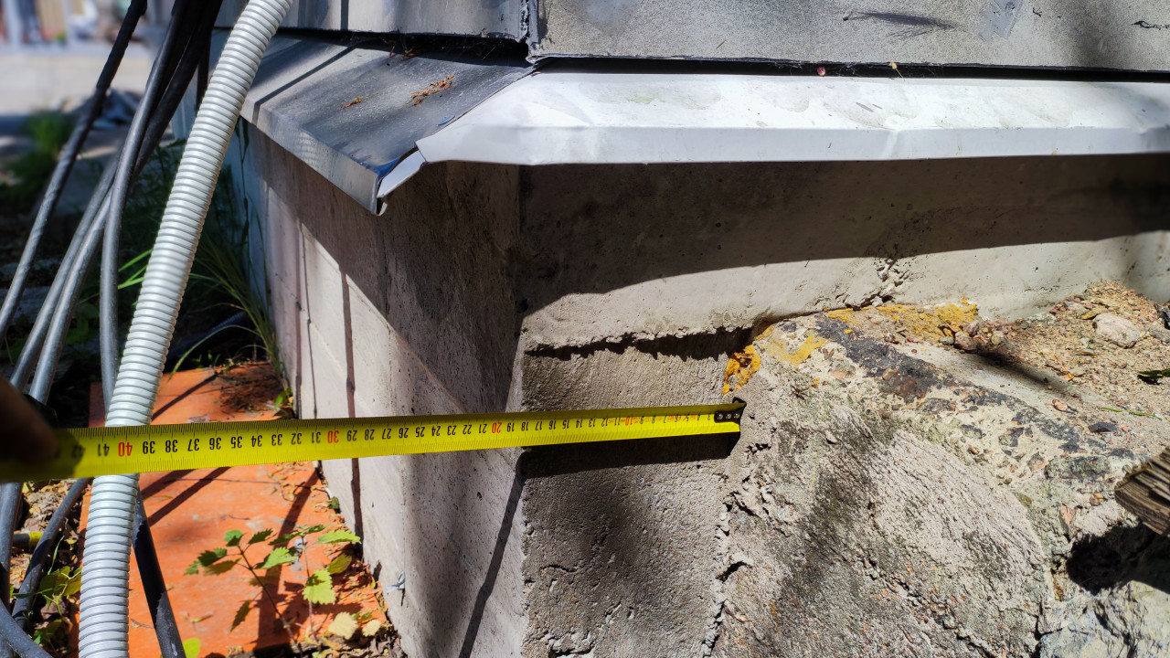 На фото показан участок бетонного фундамента здания с металлическим отливом. К основанию приложена жёлтая измерительная рулетка для фиксации ширины выступа. Слева видны электрические кабели в изоляции, а на земле растут сорняки и лежат сухие листья.