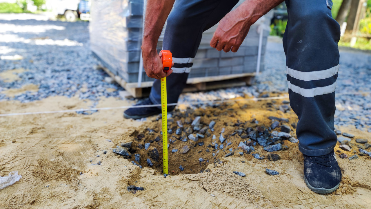 На фото крупным планом показаны руки рабочего, держащего рулетку и проверяющего глубину ямы в песчано-щебёночном основании. На заднем плане видны поддоны с тротуарной плиткой, что указывает на подготовку территории к укладке покрытия. Снимок иллюстрирует строительный процесс и этап контроля качества работ.