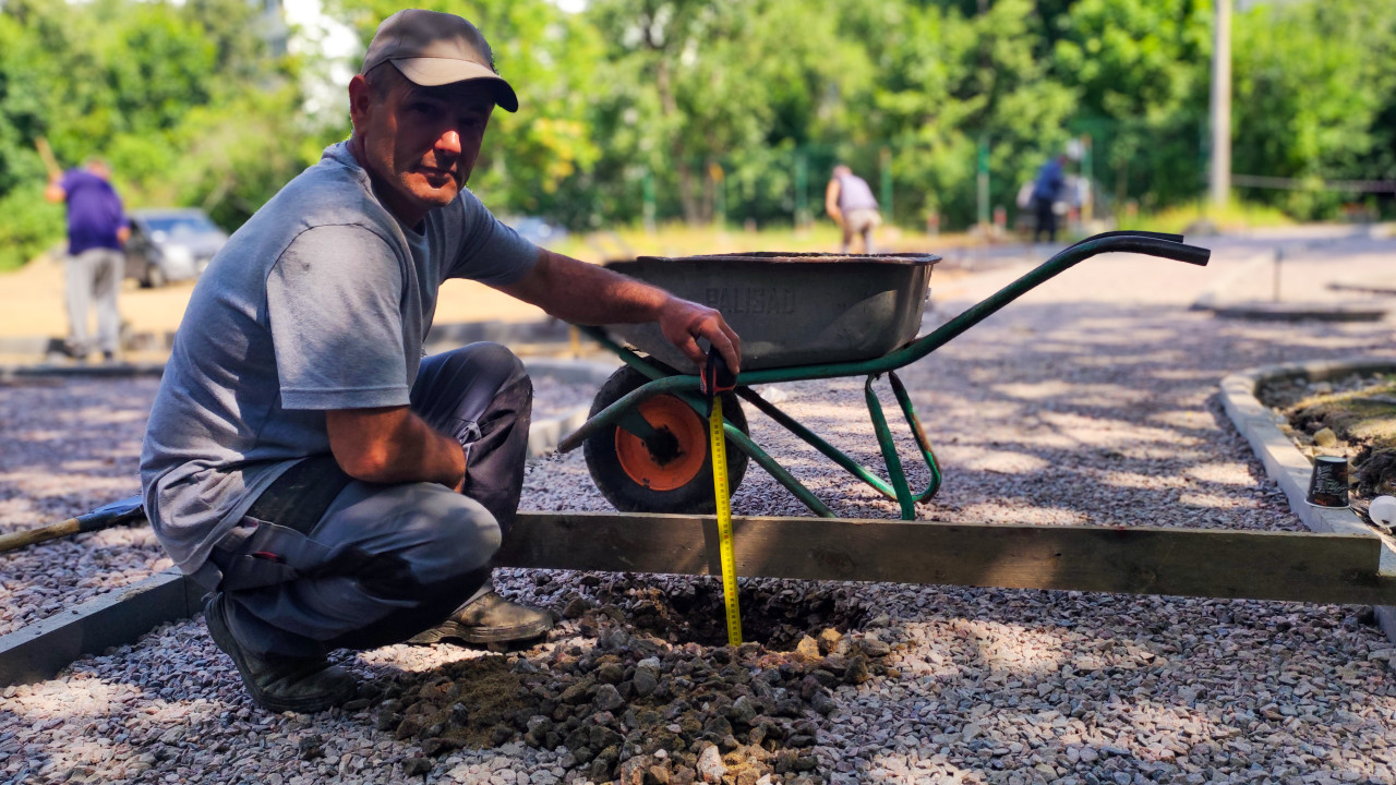 На фотографии мужчина в серой футболке и кепке присел рядом с выкопанной ямой, измеряя её глубину рулеткой. Перед ним находится зелёная строительная тачка с оранжевым колесом, рядом лежит деревянная рейка. В глубине кадра видны другие рабочие, занятые укладкой щебня. Снимок показывает важный этап контроля качества при проведении благоустроительных работ — проверку глубины углубления для установки конструкций или опор. Сцена отражает организацию рабочего процесса на открытом воздухе в летний сезон. Такой кадр может быть полезен в материалах о контроле качества, методах замера и процессе подготовки территории.