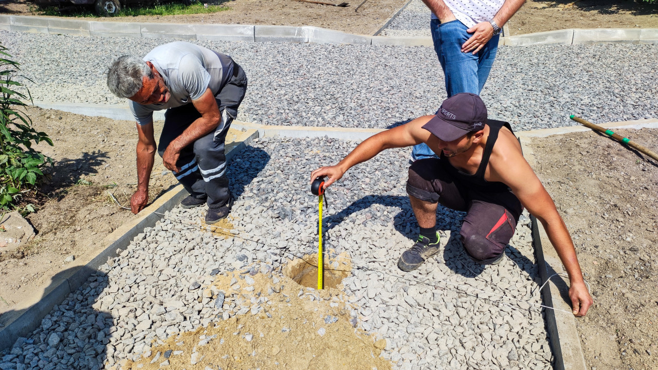 На фото рабочие измеряют глубину котлована, засыпанного песком и щебнем, с помощью рулетки. Один из них фиксирует натянутую шнурку для выравнивания бордюра. На заднем плане видны другие участники строительства и жилые дома. Снимок иллюстрирует контроль этапов подготовки под мощение плиткой.