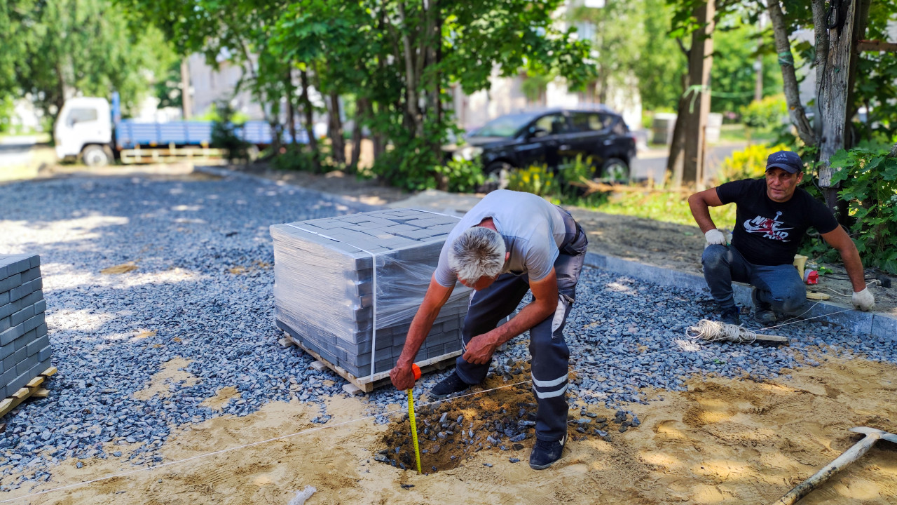 На изображении рабочий с рулеткой проверяет глубину вырытой ямы, расположенной на участке с подготовленным основанием из щебня и песка. На заднем плане видны поддоны с тротуарной плиткой и другие рабочие, занятые процессом. Сцена иллюстрирует этап проверки подготовительных работ перед укладкой покрытия. Фотографию можно использовать в иллюстрациях к статьям о благоустройстве и дорожных работах.