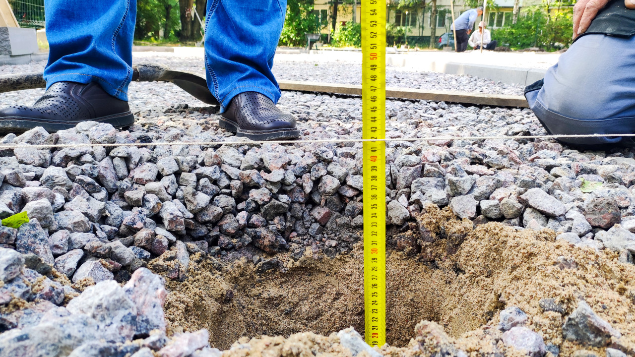 На снимке видна яма, вырытая в песчаном и гравийном основании, над которой проходит разметочный шнур. К отверстию поднесена рулетка для измерения глубины. В верхней части кадра частично видны ноги рабочих в спецобуви. Сцена фиксирует технический процесс контроля глубины перед монтажом опорных элементов или закладкой инженерных конструкций. Такой кадр иллюстрирует важный этап строительных и благоустроительных работ.