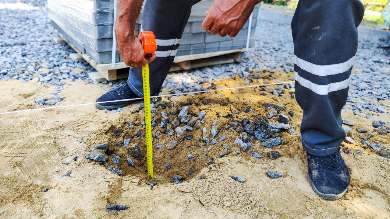 рулетка линейка измерение размеры сантиметры измерения измерительные работы обмеры замеры исследование качество контроль контроль качества проверка качества оценка качества экспертиза строительство дорожные работы глубина яма основание щебень песок укладка плитки рабочие проверка инженерные работы проектирование монтаж покрытия строительные материалы строительная площадка благоустройство ремонт дороги рабочие инструменты тротуарная плитка строительный процесс земляные работы тротуар ручной труд контроль замеров подготовка основания натянутая шнуркаПохожие фотографии