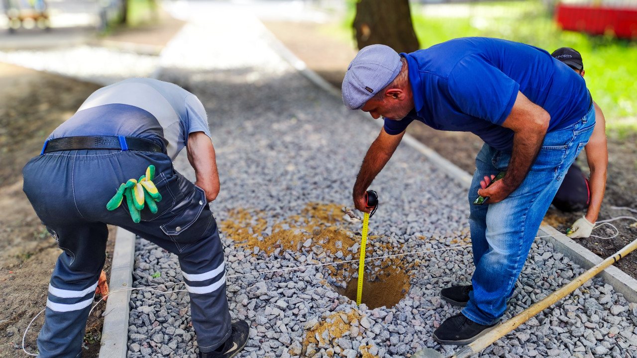Рабочие измеряют глубину ямы на щебёночной дорожке