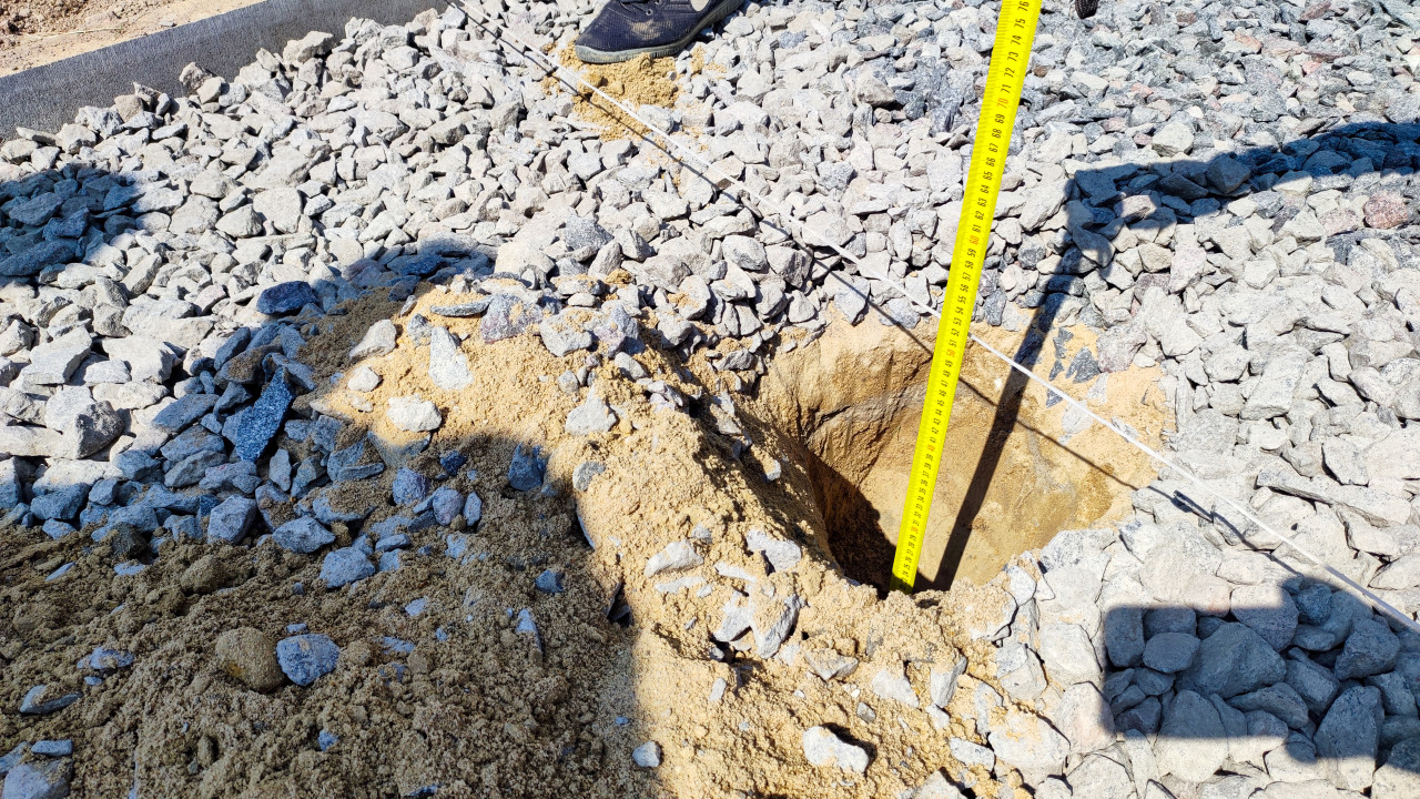 Крупный план демонстрирует яму, засыпанную песком и щебнем, в которую помещена рулетка для измерения глубины. Видна натянутая шнурка для выравнивания уровня поверхности. Снимок фиксирует этап подготовки под укладку тротуарной плитки.