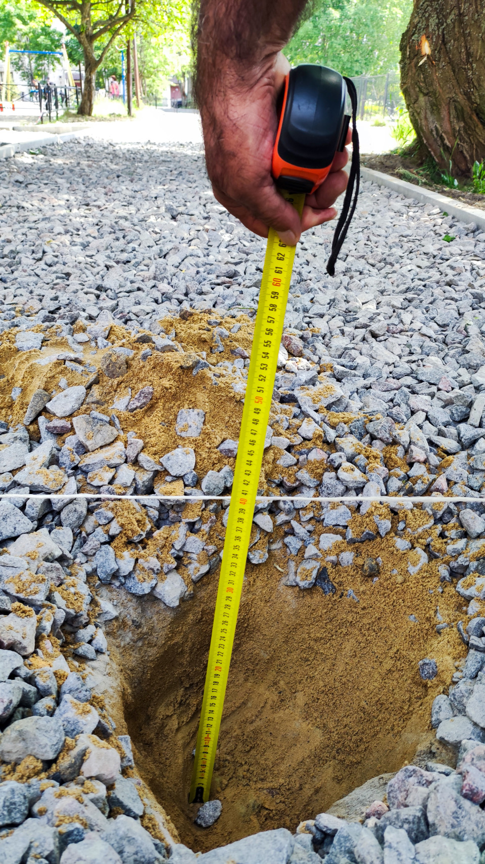 Крупный план ямы, засыпанной щебнем и песком, в которую опущена рулетка для фиксации глубины. Рука рабочего удерживает измерительный инструмент. Вокруг видны элементы натянутой шнурки для выравнивания. Изображение демонстрирует этап проверки подготовительных работ перед укладкой покрытия.