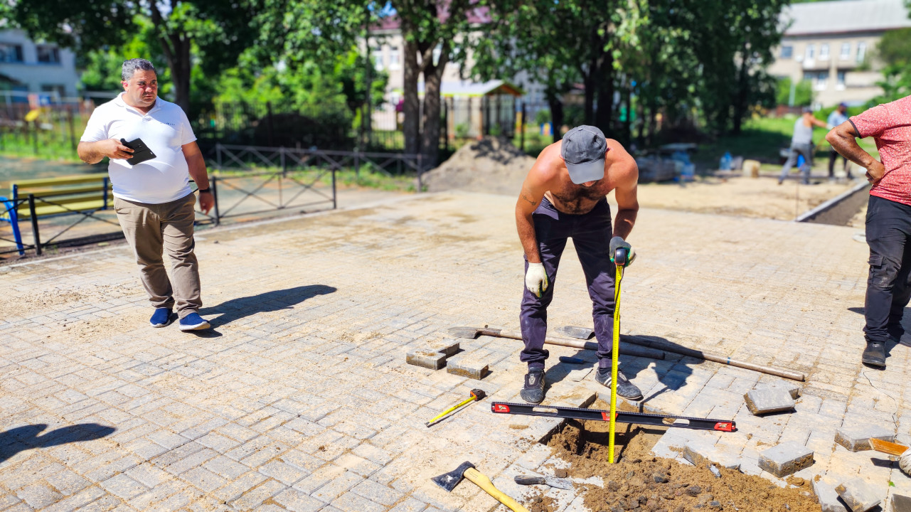 На фотографии мужчина без рубашки проводит замеры глубины выкопанного участка на мощёной площадке с помощью рулетки и уровня, фиксируя соответствие строительным нормам. Рядом стоит человек в белой футболке с планшетом, контролирующий процесс, а также видны другие рабочие на заднем плане. На земле лежат строительные инструменты — уровень, лом, перчатки. Сцена происходит на улице, в тёплое время года, на фоне зелёных деревьев и жилых построек. Снимок отражает контроль качества и точность в процессе дорожных и строительных работ.
