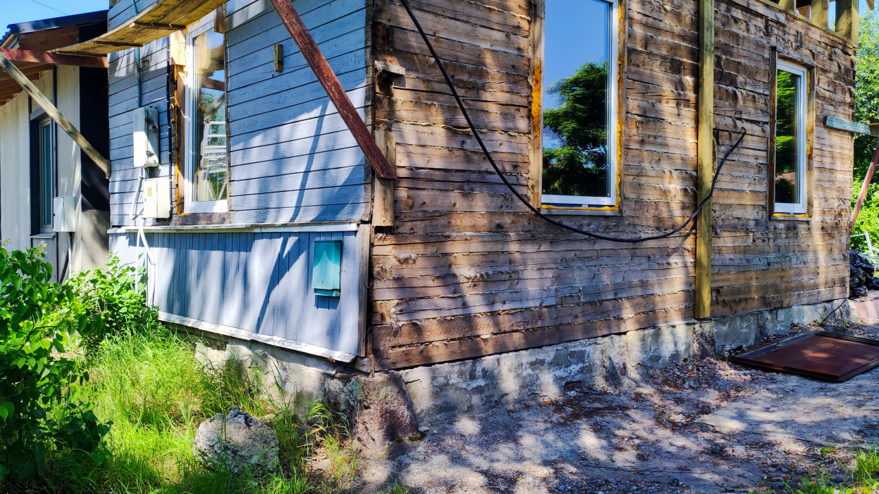 На фото изображена боковая часть дома с двумя современными пластиковыми окнами, встроенными в старую деревянную стену. Между венцами заметен утеплитель, часть досок имеет следы старения. На фасаде установлены новые вертикальные деревянные балки для усиления конструкции, а крыша дополнена обрешёткой. Слева видна пристройка, окрашенная в голубой цвет. Фотография иллюстрирует этап реконструкции деревянных зданий.