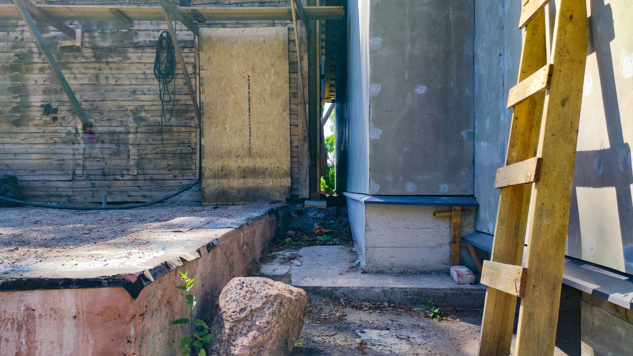 На фото изображён узкий проход между старым деревянным зданием и новым строением с бетонным основанием и штукатуркой на стенах. Слева видна деревянная лестница, ведущая к рабочей зоне, на земле лежат камни и строительные отходы. Часть стены старого здания закрыта плитой OSB.