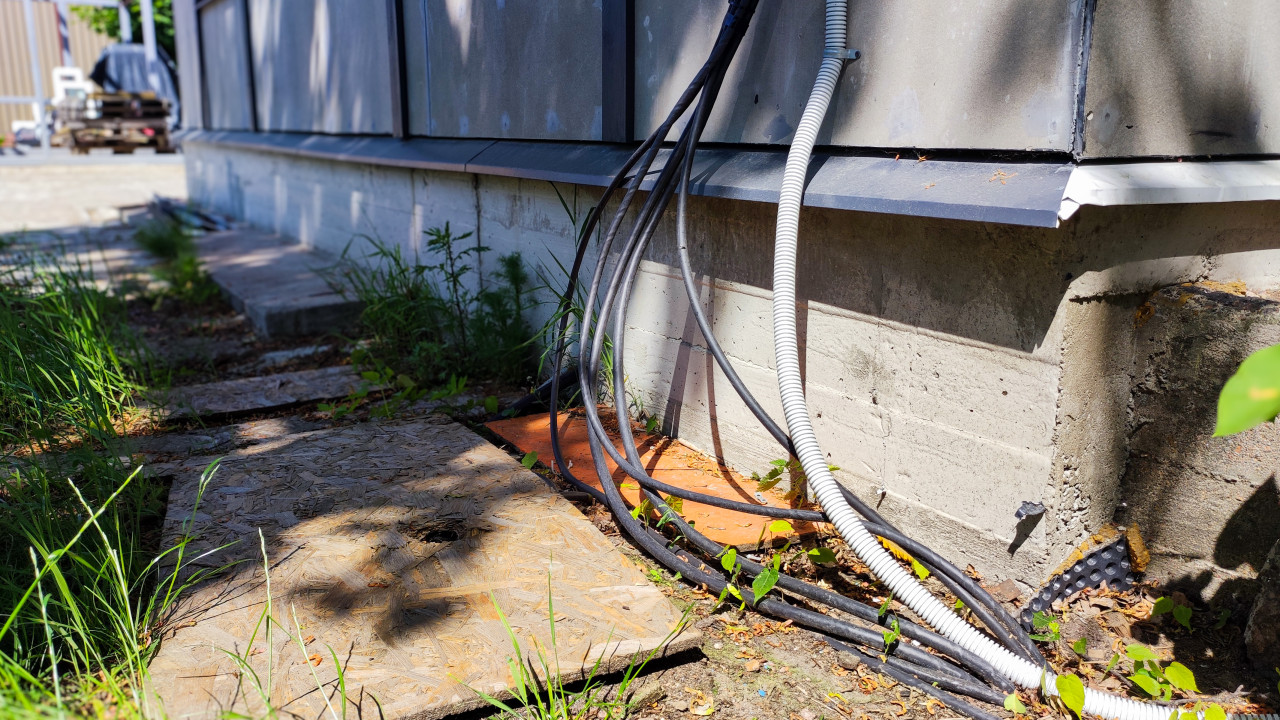Фотография показывает участок бетонного фундамента здания с металлическим отливом. Вдоль стены уложены кабели в защитной изоляции, а рядом находятся деревянные щиты и сорная растительность. Видно, что часть фундамента имеет дефекты и следы ремонта.