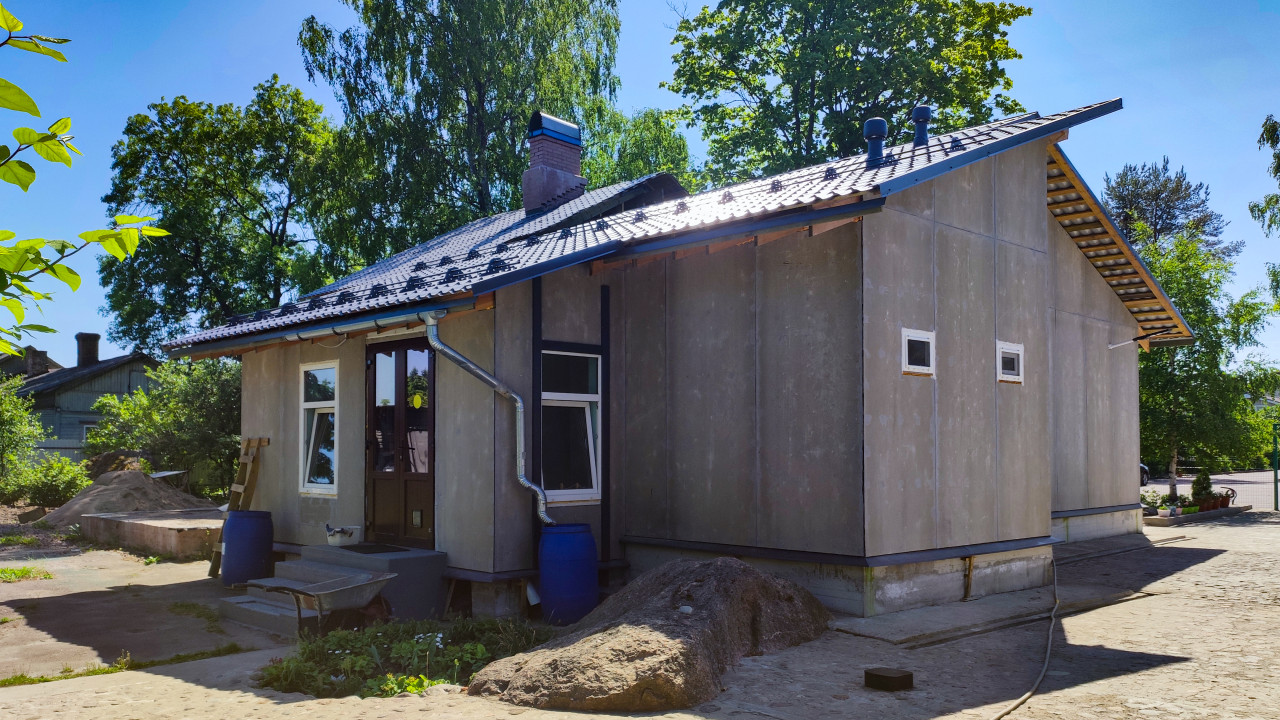 На фото показан жилой дом в процессе завершения реконструкции: стены покрыты листовым материалом, крыша перекрыта металлочерепицей, установлены пластиковые окна и водостоки. Рядом видны строительные материалы и ёмкости для воды. Снимок демонстрирует современный этап благоустройства дома после реконструкции.