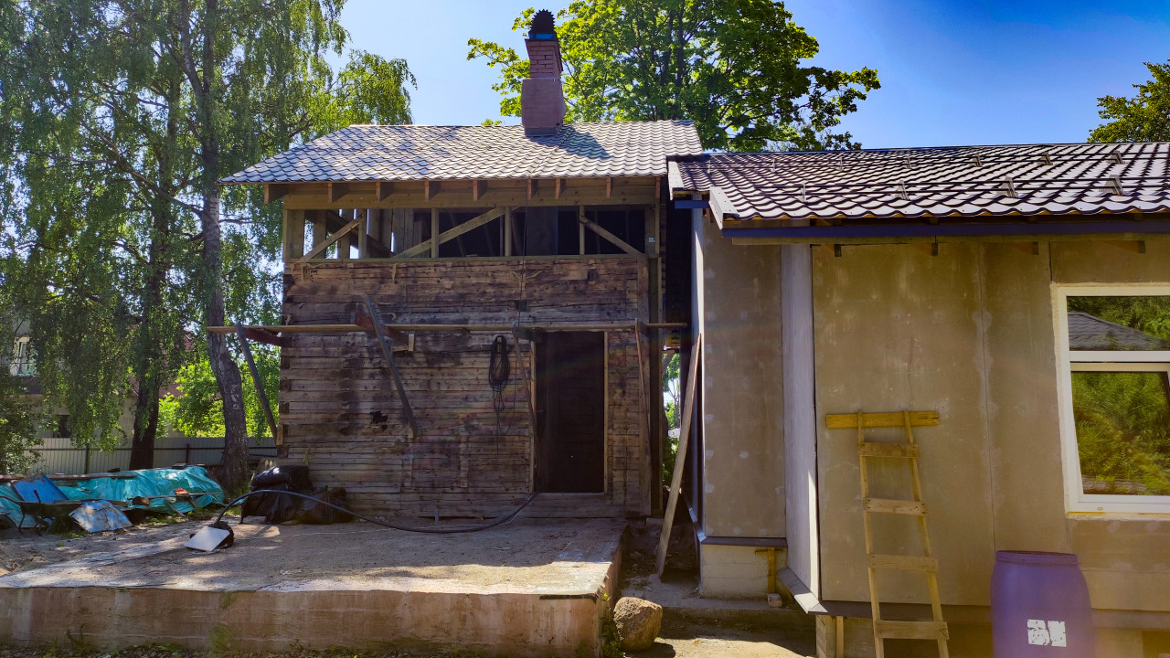 Деревянный дом в процессе реконструкции с частично обновлённой крышей