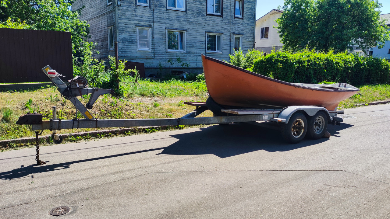 На фотографии показан прицеп с установленной лодкой коричневого цвета, припаркованный на асфальтированной улице рядом с жилыми домами. Лодка закреплена на двухосном прицепе, на заднем фоне виден деревянный дом и зелёные насаждения. Снимок сделан днём в летний период. Фотография может использоваться для иллюстраций транспортировки лодок, загородной жизни или тем, связанных с отдыхом и ремонтом маломерных судов.