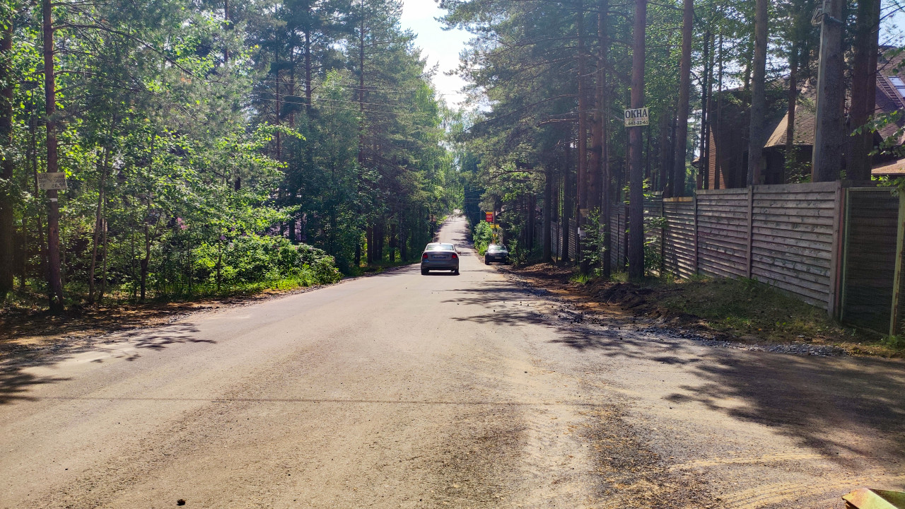На фотографии показан участок асфальтированной дороги, пролегающей через лесистую местность. По обе стороны дороги растут высокие сосны и лиственные деревья, справа виден длинный забор частного участка, за которым угадывается жилой дом. На проезжей части движутся автомобили, один из них уходит вдаль. Снимок демонстрирует сочетание инфраструктуры и природного окружения, характерное для пригородных поселков. Объектов культурного или исторического значения кадр не содержит. Фото можно использовать в темах транспорта, дорожного строительства и загородной инфраструктуры.