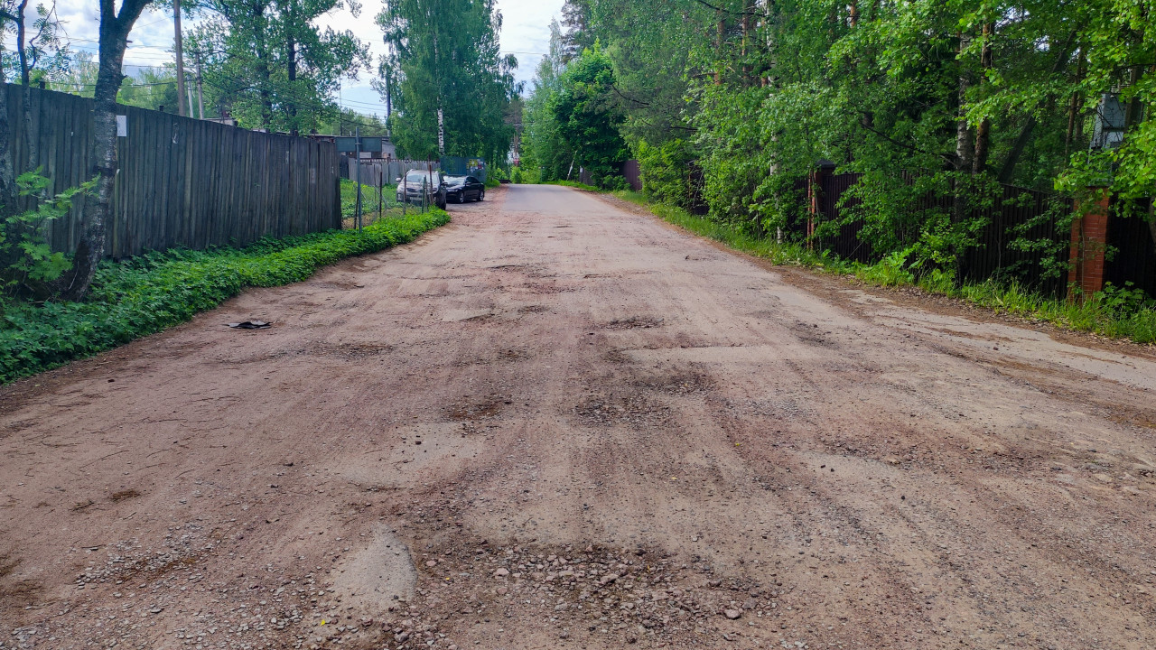 Фотография демонстрирует грунтовую дорогу с многочисленными выбоинами и следами разрушений, проходящую вдоль деревянного забора и зелёных насаждений. Вдоль дороги припаркованы автомобили, на заднем плане видна застройка. Снимок показывает состояние местной уличной инфраструктуры и может использоваться в материалах о сельских дорогах, транспортной доступности и проблемах благоустройства.