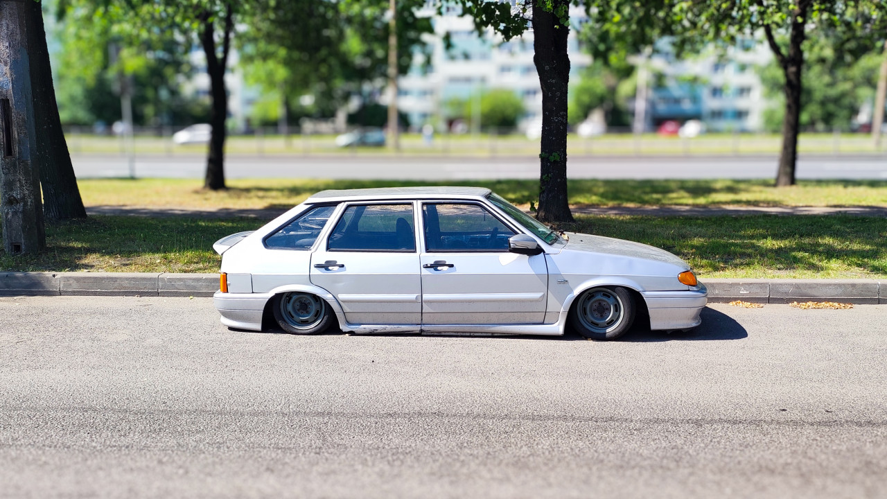 На фото изображён белый автомобиль ВАЗ с изменённой подвеской и заниженным клиренсом. Машина припаркована вдоль тротуара в тени деревьев, на фоне жилых многоквартирных домов. У автомобиля сохранены характерные черты кузова хэтчбек. Снимок сделан в солнечный день, присутствует зелёная растительность и асфальтовая дорога. Фотографию можно использовать в материалах о городской инфраструктуре, тюнинге автомобилей и культуре модификаций техники в России.