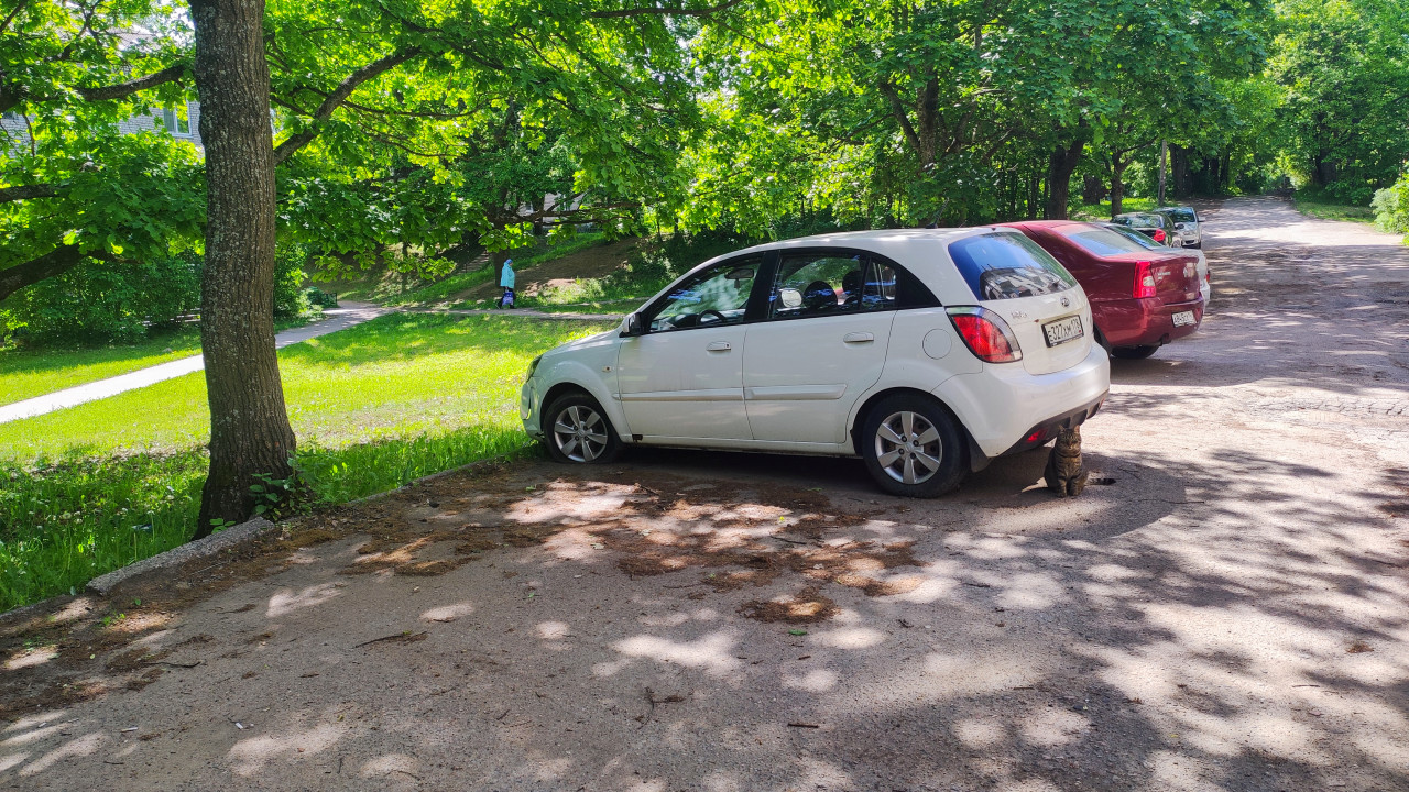 На фото изображен белый легковой автомобиль, припаркованный у двора жилого дома. Под задним бампером машины сидит кот. Рядом видны другие автомобили и зелёные насаждения. В глубине кадра заметны пешеходы. Снимок иллюстрирует тему дворовой парковки, соседства автомобилей и домашних животных в городской среде.