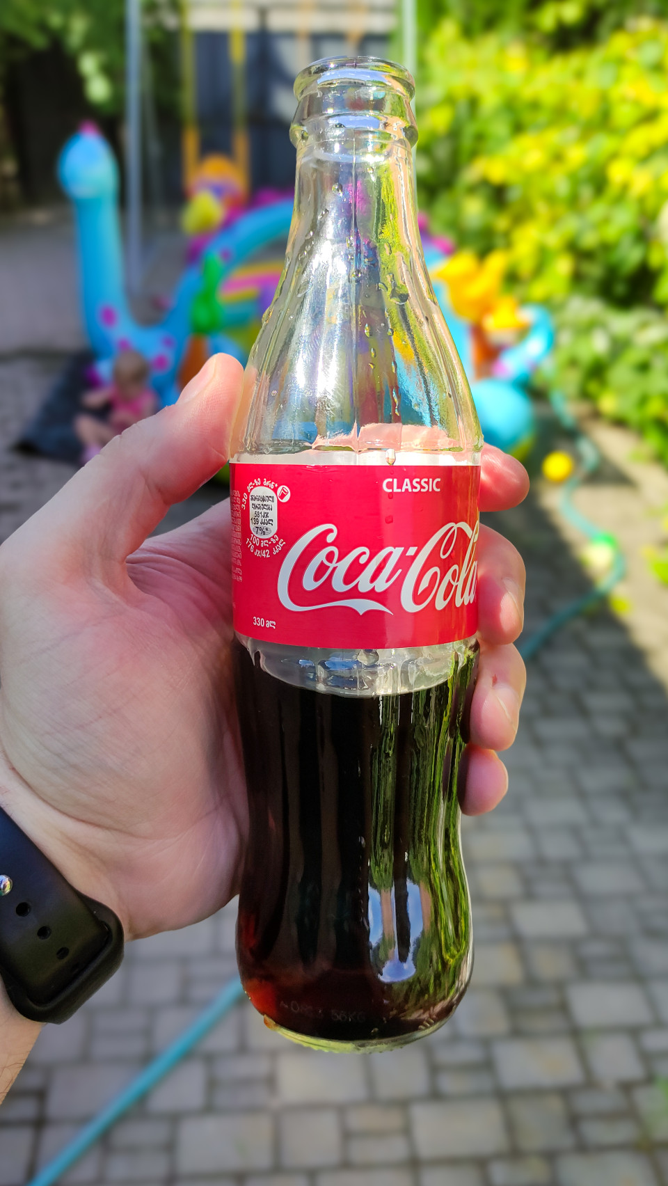 coca cola стеклянная бутылка газированный напиток сода кола красная этикетка бренд напитки рука держит бутылку крупный план refreshment лето outdoor освежающий напиток 330 мл classic газировка брендированный продукт международный бренд напитки на природе напиток в бутылке прохладительный напиток фото продукта бутылка в руке освежениеПохожие фотографии
