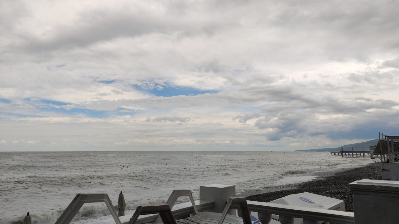 море пляж галечный берег пирс набережная зонты шезлонги облака пасмурно волны горизонт горы побережье инфраструктура лето отдых вода природа пейзаж курорт туризм климат приморский город черное море курортная зона сезонПохожие фотографии
