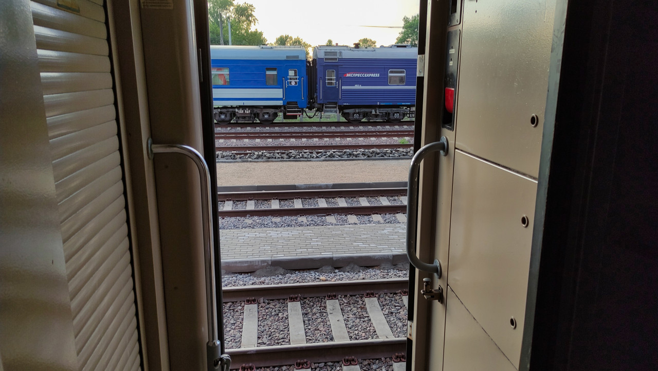 Снимок сделан изнутри пассажирского поезда и показывает вид на соседние вагоны через открытую дверь. На заднем плане виден синий вагон с надписью «Экспресс Express» и ещё один пассажирский состав. В кадре присутствуют металлические поручни и дверная конструкция вагона. Фото можно использовать для публикаций о железнодорожных перевозках, транспортной инфраструктуре и особенностях междугородних поездок.