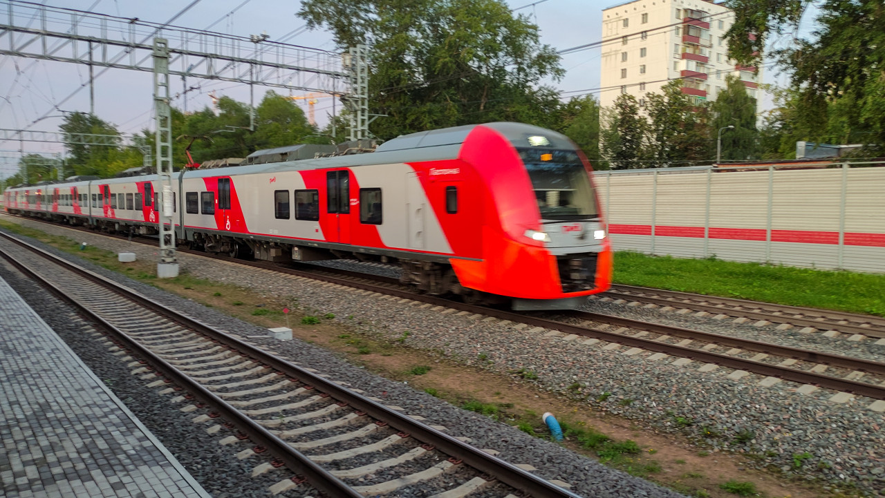 На снимке изображён электропоезд «Ласточка» серого и красного цвета, движущийся по железнодорожным путям. Состав снят вблизи, что подчёркивает его современный дизайн и динамику. На заднем плане можно заметить зелёные деревья, забор с красной полосой и многоэтажный жилой дом. Фото подходит для тем, связанных с железнодорожным транспортом, городскими перевозками и современной инфраструктурой России.