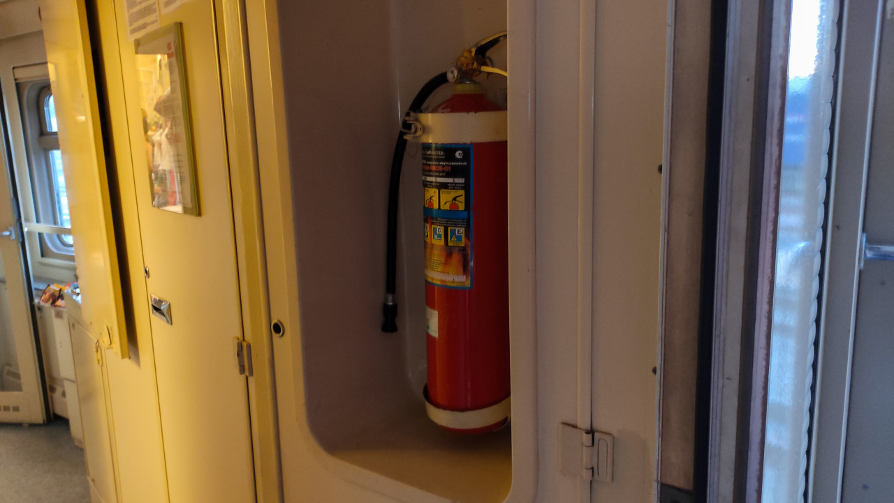Огнетушитель в нише железнодорожного вагона