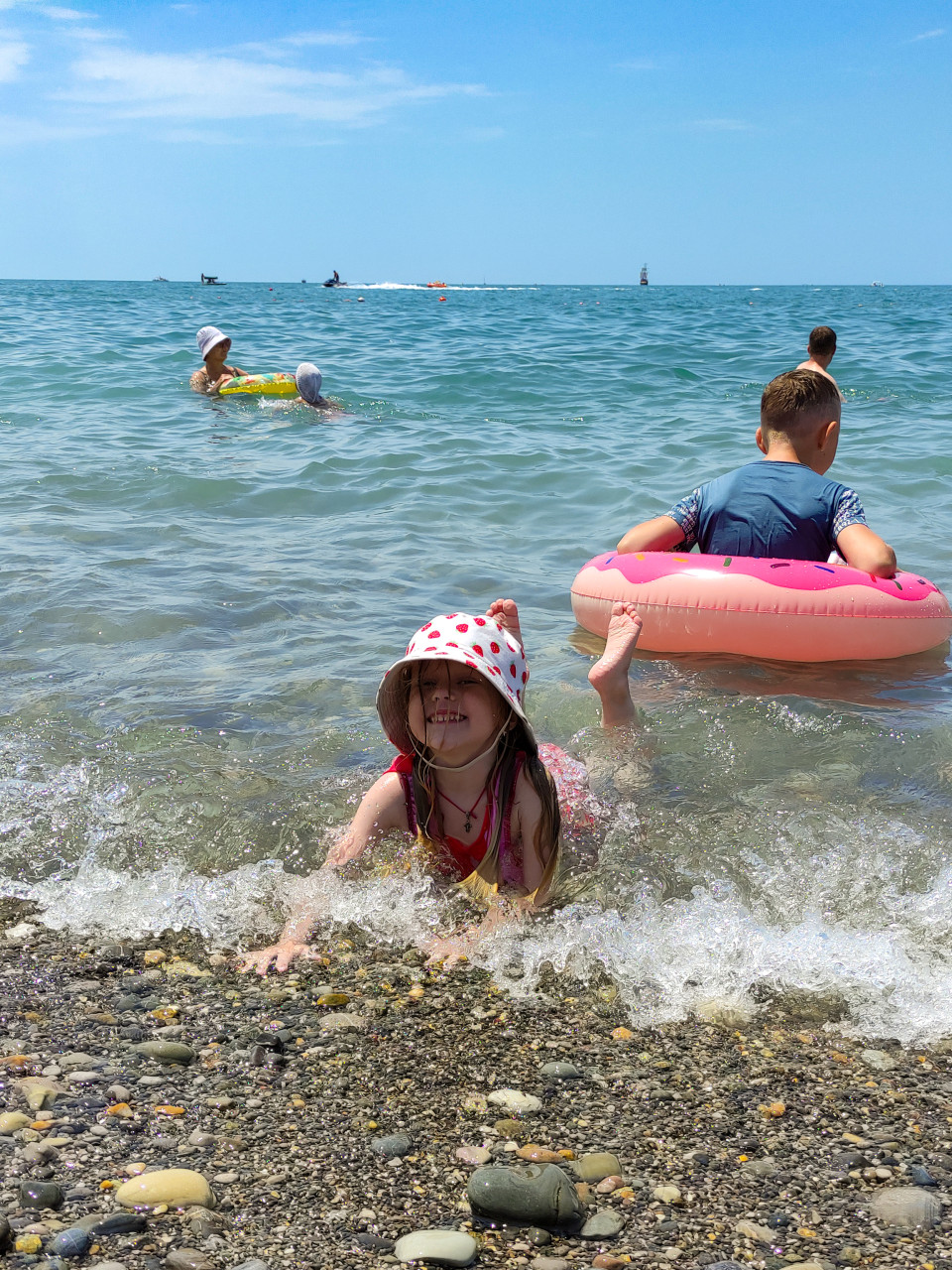 пляж море ребёнок девочка дети отдых лето солнце каникулы побережье вода волны семейный отдых туризм курорт детство летний сезон камни игра купальник панама надувной круг отпуск пляжный отдых туристы активный отдых галечный пляжПохожие фотографии