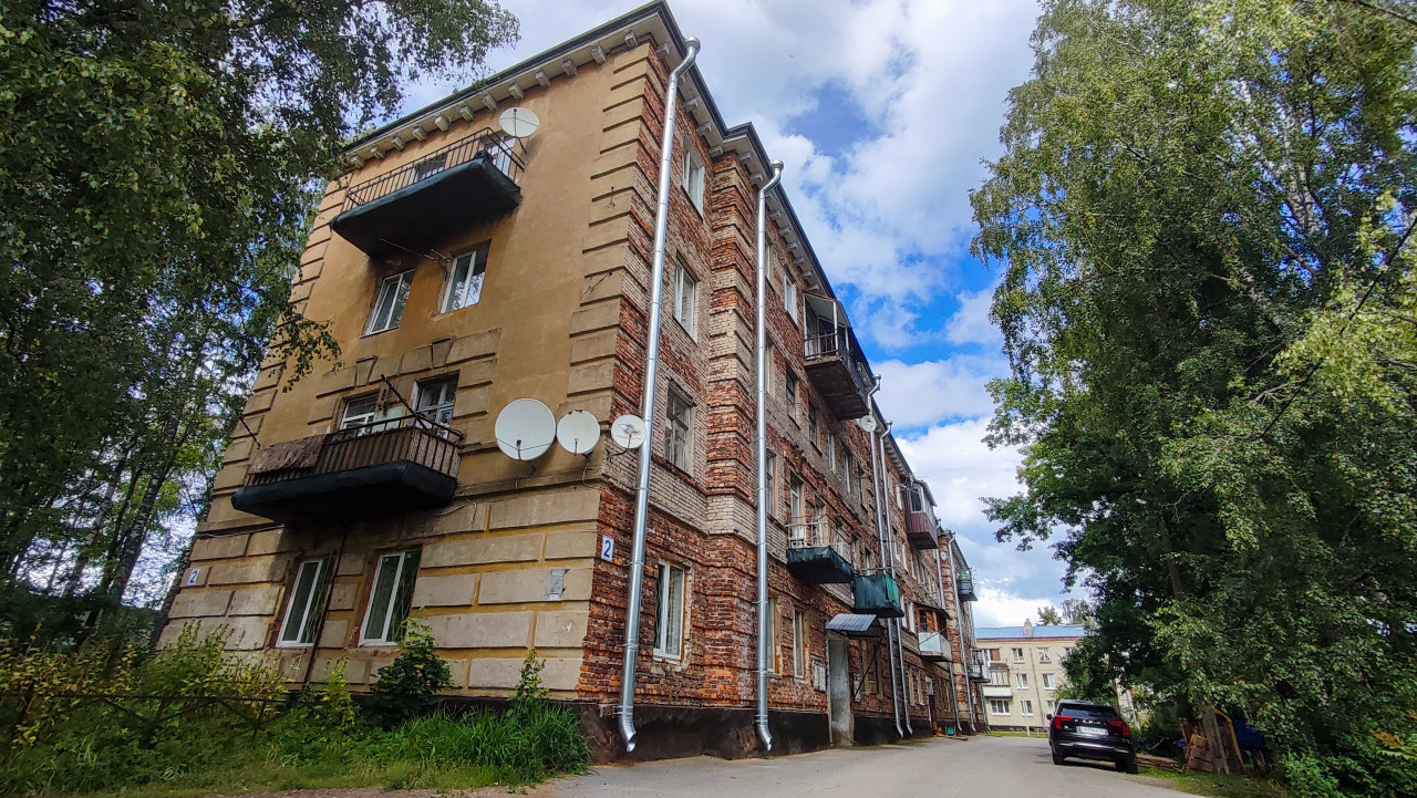 На фото изображен фасад четырёхэтажного жилого дома советской застройки с кирпичными стенами, балконами и установленными спутниковыми антеннами. Видны новые металлические водостоки, заменённые в рамках ремонта. Здание окружено зелёными насаждениями и деревьями. Снимок фиксирует архитектуру середины XX века, характерную для массового жилищного строительства в СССР, и может быть использован для иллюстрации жилого фонда, архитектурных исследований и материалов о реконструкции.