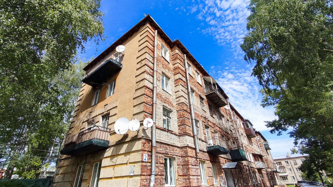 На фотографии изображено угловое здание из красного и белого кирпича с балконами и множеством спутниковых антенн. Это типичный жилой дом советского периода, сохранившийся в городской среде. На фасаде видны металлические трубы водостока и элементы штукатурки. Здание окружено деревьями, а на заднем плане заметны другие жилые строения. Фото демонстрирует архитектуру массовой жилой застройки середины XX века, которая до сих пор используется. Фотография может применяться в публикациях о городской архитектуре, истории советской застройки и жилищной политике.