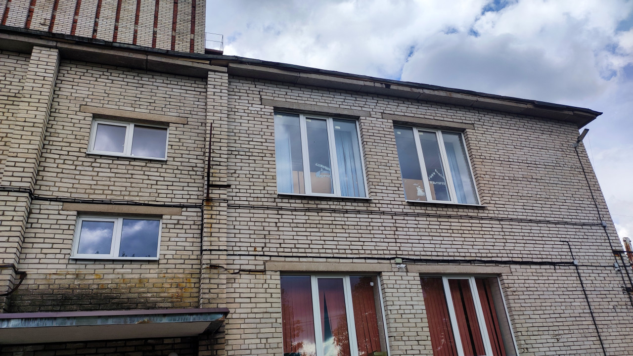 Фотография показывает часть кирпичного фасада двухэтажного здания с окнами разных размеров. Некоторые окна оборудованы пластиковыми рамами, на стекле видны наклейки и жалюзи. Нижняя часть стены потемнела от влаги и загрязнений, что указывает на длительную эксплуатацию. На крыше заметны металлические трубы и элементы инженерных коммуникаций. Общий вид характерен для административных и хозяйственных построек постсоветского периода. Снимок может быть использован для иллюстрации городской архитектуры, состояния зданий и их внешнего вида.