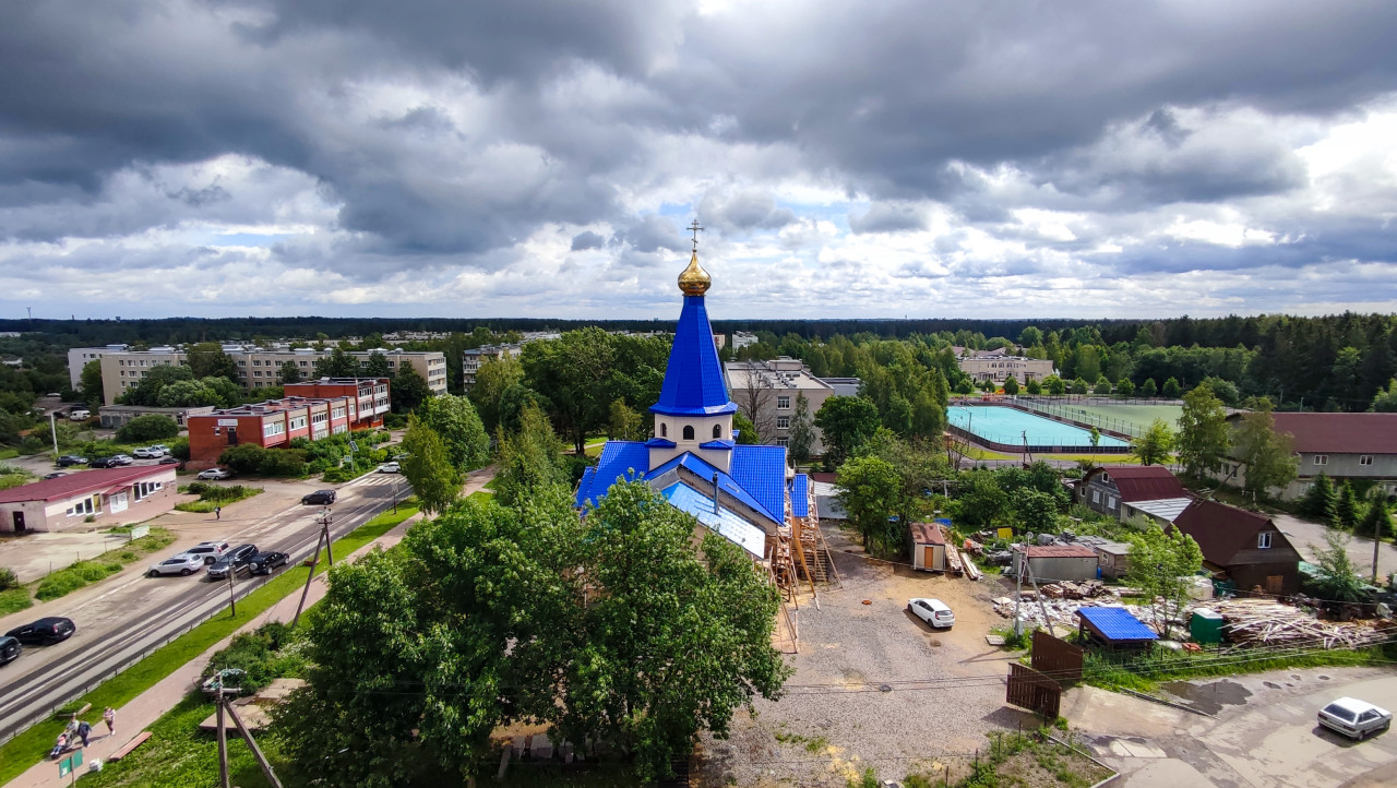 На фотографии показан православный храм с ярко-синим шатром и золотым куполом, возвышающимся среди жилой застройки и зелёных насаждений. На переднем плане заметна строительная площадка и техника, вокруг здания ведутся работы по благоустройству. По соседству располагается спортивный комплекс с зелёным покрытием, а также жилые дома и улицы. Храм выделяется как духовный и архитектурный центр района. Кадр отражает взаимодействие религиозных объектов и современной городской инфраструктуры.
