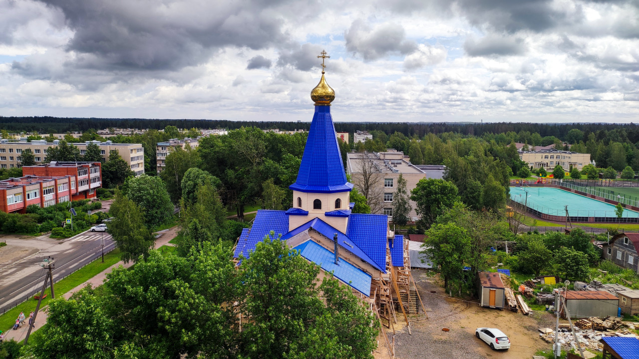 На фото изображён православный храм, выделяющийся своим архитектурным решением: синим шатровым верхом и золотым куполом с крестом. Храм окружён зелёными деревьями и жилой застройкой, рядом расположена спортивная площадка с теннисными кортами. На переднем плане видны строительные материалы и техника, что говорит о продолжающихся работах по благоустройству территории. Данное фото отражает современное состояние религиозного объекта и может использоваться в публикациях о православной архитектуре, строительстве и культуре России.