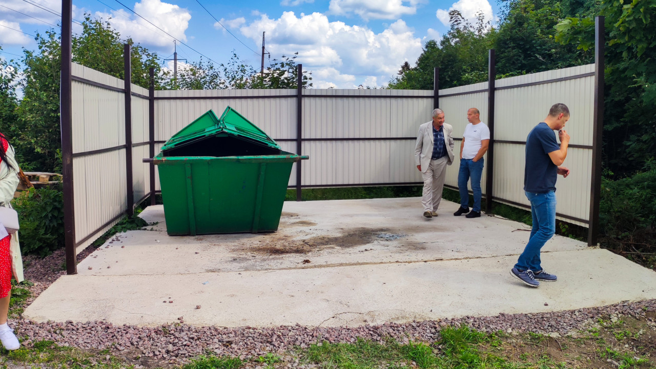 На фото показана современная контейнерная площадка с бетонным основанием и металлическим ограждением, установленная для сбора твёрдых бытовых отходов. В центре находится зелёный контейнер с приоткрытой крышкой. Несколько человек осматривают объект, что может указывать на приёмку или проверку выполненных работ. Сцена снята днём, при солнечной погоде, с деталями инфраструктуры и зелёных насаждений вокруг.