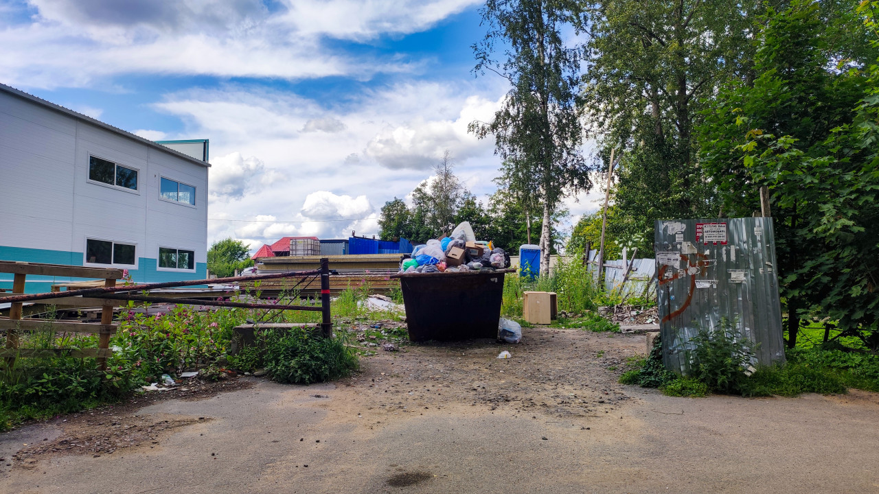 Снимок фиксирует переполненный мусорный контейнер на фоне производственного здания и зелёных насаждений. Контейнер заполнен мешками и коробками, часть отходов расположена рядом. Слева видна постройка с бело-голубым фасадом, справа — деревья и забор из металлических листов. Фото отражает проблему утилизации отходов и переполненности контейнеров.